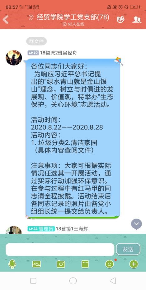 (通讯员 颜婷婷)为响应党的号召,践行“坚持人与自然和谐共生”的基本方略。2020年8月22日,经济贸易学院学工党支部开展“生态保护,关心环境”志愿活动,号召支部全体党员和18、19级入党积极分子于各自所在地的社区、街道、小区或住宅区域积极主动投入志愿环保工作中。