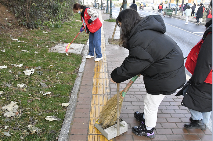 全体志愿者分成五组跟随环卫叔叔和阿姨们完成了从湖南商务职业技术学院天猫校园店至学院南门路段的卫生打扫工作。看似简单的挥动扫把,却需要无数次的弯腰和低头,通过亲身参与环卫工作,志愿者们体会到社会基层工作的艰辛与不易,感受到环卫工作在清扫垃圾的过程中也净化了我们的心灵。