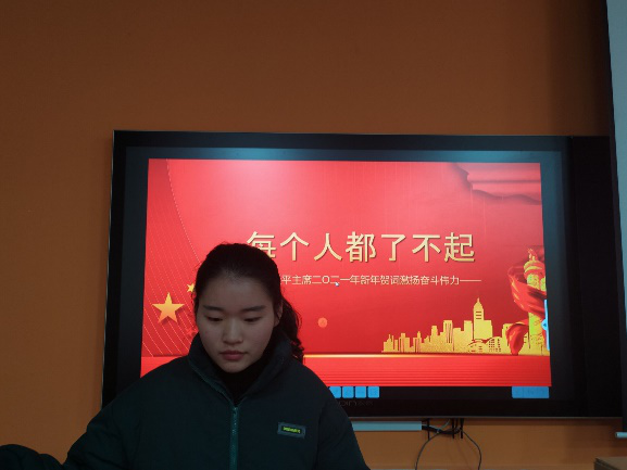 接下来,刘容同志为同志们分享“习近平2021年新年贺词——激扬奋斗伟力”,讲述了“平凡铸就伟大,英雄来自人民”的梁顺护士,“艰难方显勇毅,磨砺始得玉成”的叶培建院士,并带领同志们观看视频《写给2021的一封贺卡》(新华社)。