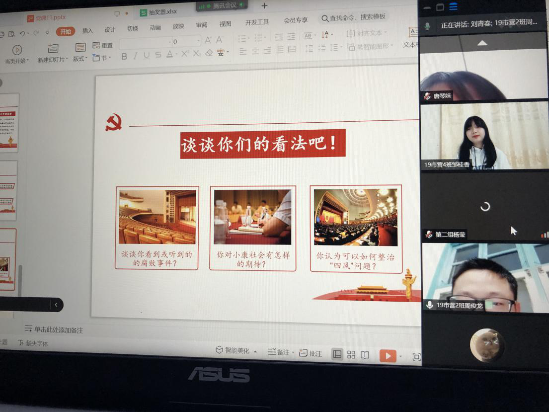 (通讯员 谭静宜)为深入学习贯彻习近平总书记重要讲话精神,旗帜鲜明讲政治,不断提高政治判断力、政治领悟力、政治执行力,2021年2月2日晚上7:00,经济贸易学院学工党支部通过腾讯在线会议网络平台开展“牢记使命·学习重要讲话精神”主题党日活动。本次主题党日活动由青春向党先锋营第一小组刘腾同学主持,经济贸易学院学工党支部全体党员、入党积极分子参加此次活动。
