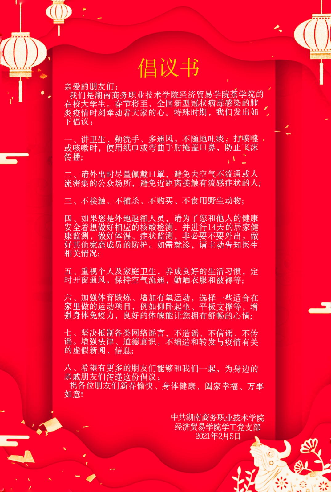 我们是湖南商务职业技术学院经济贸易学院茶学院的在校大学生。春节将至,全国新型冠状病毒感染的肺炎疫情时刻牵动着大家的心。特殊时期,我们发出如下倡议: