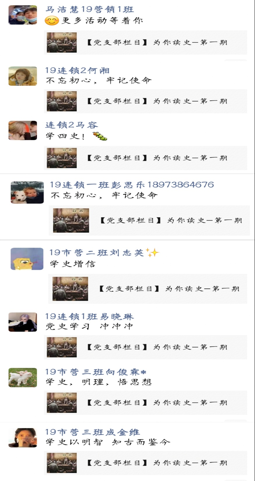 当第一期“为你读史”栏目经经贸绽青春公众号推出之后,获得同学们积极关注和好评。大家纷纷为活动点赞并转发至朋友圈进行宣传。其中,党员发展对象方嘉成同志感言到:“坚定理想信念,坚守共产党人精神追求,始终是共产党人安身立命的根本。真正学好历史精神,就要承接历史担当、情怀、责任、信念。”入党积极分子董优梅同志也表示:“要不忘初心、牢记使命、永远奋斗!”