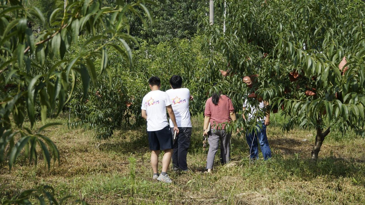 7月13日,在果农的带领下,队员们顶着烈阳,来到了海拔1300多米高的山坡上,调研黄桃园果树种植情况以及黄桃的质量和品质。黄桃树种植广,但树都不是很高,因为这片黄桃园种植时间并不是很长,树种偏矮,且土地土壤湿润。所有的炎陵黄桃都绑着红带子,果农李叔解释道:“这样的黄桃不仅可以避光,防止太阳照射而变红,并且可以防止蚊虫叮咬。不仅如此,有时候蚊虫多的时候,我们大晚上还得进果园在黄桃树上抓虫。因为我们的黄桃是禁止喷洒农药的。为了保证黄桃的品质,我们的黄桃基本上使用农家肥进行浇灌,很少使用化肥。这样的黄桃成色好品质好,同时也能保障消费者舌尖上的安全。”