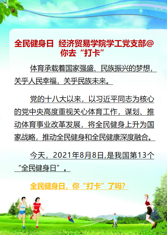 8月8日是中国第13个“全民健身日”。恰如今年“全民健身日”的主题——“全民健身与奥运同行”。东京奥运赛场上,中国体育健儿们的精彩表现,给我们留下深刻印象,更在场外掀起一轮运动热潮。今天,在这个特殊的日子里,经济贸易学院学工党支部@你去运动“打卡”。愿你在每一个平常日子里,享受运动带来的健康和欢乐。