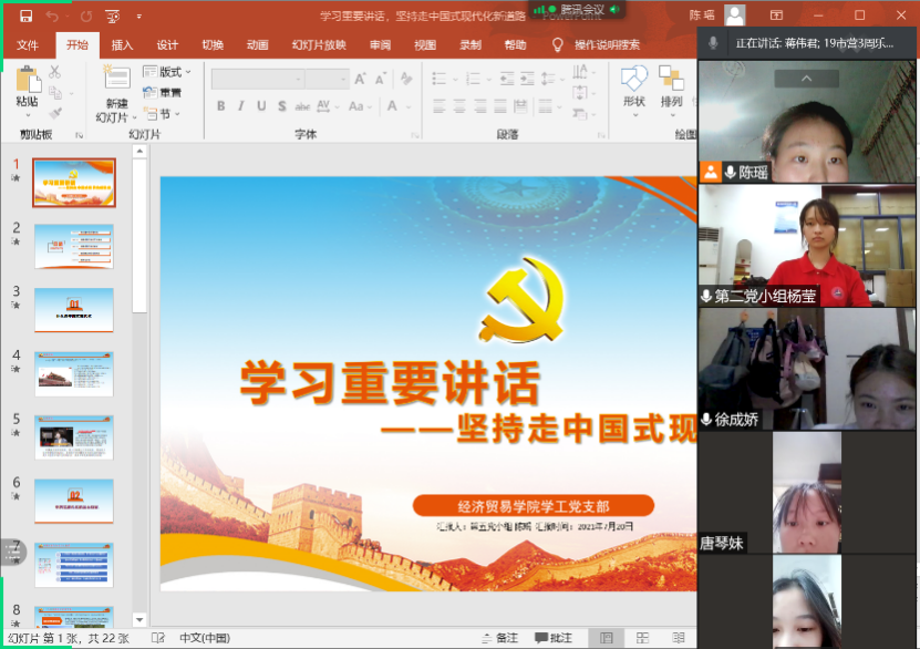 (通讯员 陈瑶)百年奋斗创造了“中国式现代化新道路”,2021年7月20日晚8:00,经济贸易学院学工党支部以线上会议的形式开展了“学习重要讲话——坚持走中国式现代化新道路”的主题党日活动。主持人为“青春向党”先锋营第五小组陈瑶同志,经济贸易学院学工党支部全体预备党员、入党积极分子参加此次活动。