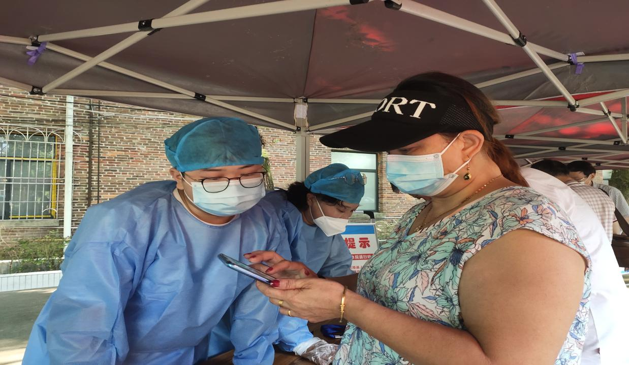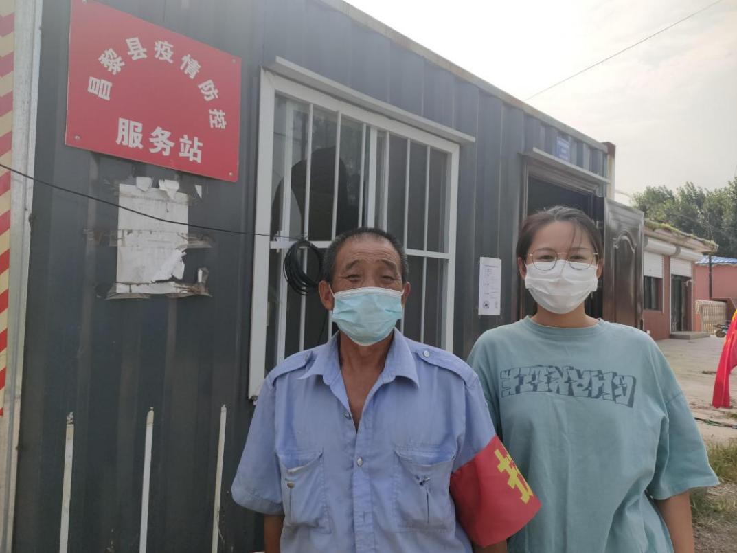 ▲肖悦迎同学与当地防疫工作者一起执勤