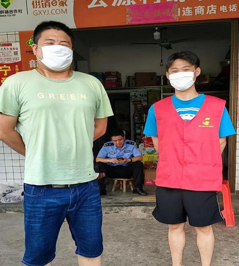 ▲邓盛民同学正在维护预约疫苗者排队秩序