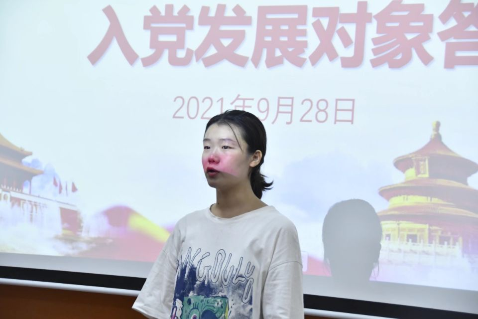 9月28日下午2:30,经济贸易学院学工党支部在第二教学楼101教室开展“发展新党员·增添新力量”答辩大会。大会由预备党员陈灿同志主持,19名发展对象候选人针对自己的实际学习经历、获奖情况、申请入党前后思想上、行为上的认识改变进行简明扼要的介绍。在答辩环节,每位发展对象候选人依照抽选的题回答有关党的理论问题,同志们随机答辩,实事求是、自信的展现自我,表明决心。其中,19级商务管理3班吴晓兰同志在回答“结合实际谈谈为什么要入党?入党动机是什么?”时留下了动情的泪水,她用真诚的语言讲诉着:“作为中华儿女,祖国的繁荣与昌盛是所有中国人的心愿,个人与国家密不可分。我们要心怀祖国,付诸行动;要继承和发扬革命精神,铭记历史;要做一把中国共产党的利剑,去维护公平与正义,除去世间的污秽。”