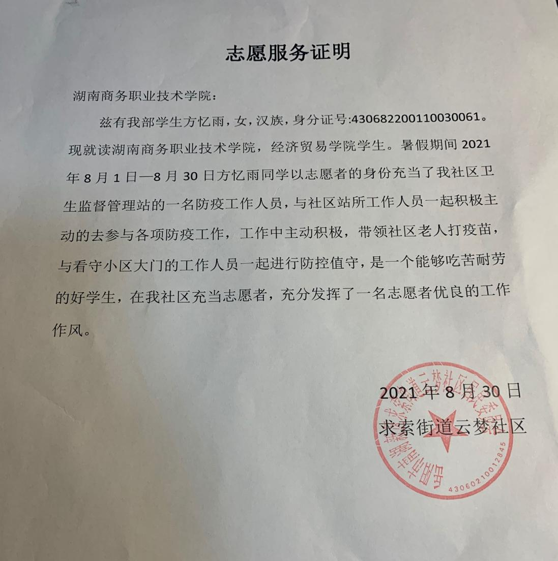 (通讯员 杨韵琴)在“鱼米之乡”的岳阳,面对今年暑假突然而来的疫情,湖南商务职业技术学院经济贸易学院19级连锁经营管理2班方忆雨同学成为了一名抗疫志愿者。
