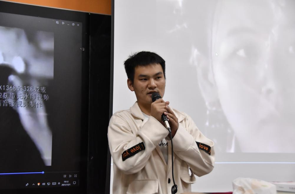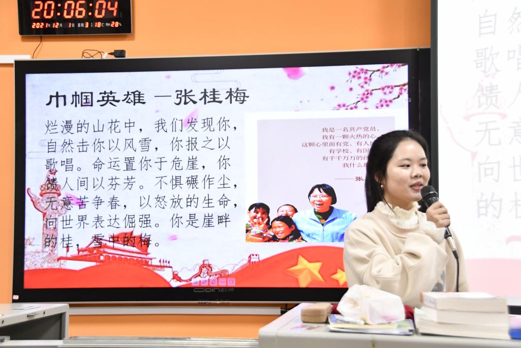随后,贺雨南同学带领同学们走进“燃灯校长”张桂梅的事迹中。“‘鹤发银丝映日月,丹心热血沃新花’。张桂梅扎根边疆,立德树人,不仅用责任和担当照亮了山区女孩的前程,更塑造灵魂,将“知识改变命运”的价值观传递到大山深处。这位大山深处的‘老师妈妈’虽身体孱弱多病,但她却为‘教育扶贫’倾尽全力,命运将她置之以危崖,她却赠人间以芬芳,以怒放的生命,向世界表示倔强。” 贺雨南动情的讲述声在会场回荡,不时有同学在小声啜泣。在故事的尾声处,贺雨南同学说到:“教师是人类灵魂的工程师。十年树木,百年树人。一直以来,他们就像一位园丁,用自己的心血培养着祖国的花朵,用智慧和汗水塑造了时代的辉煌。我们青年学生要怀揣感恩之心,用实际行动去敬爱老师、去铭记老师的恩情。同时,我心中一直有个梦想,成为一名像张桂梅老师一样的老师。”