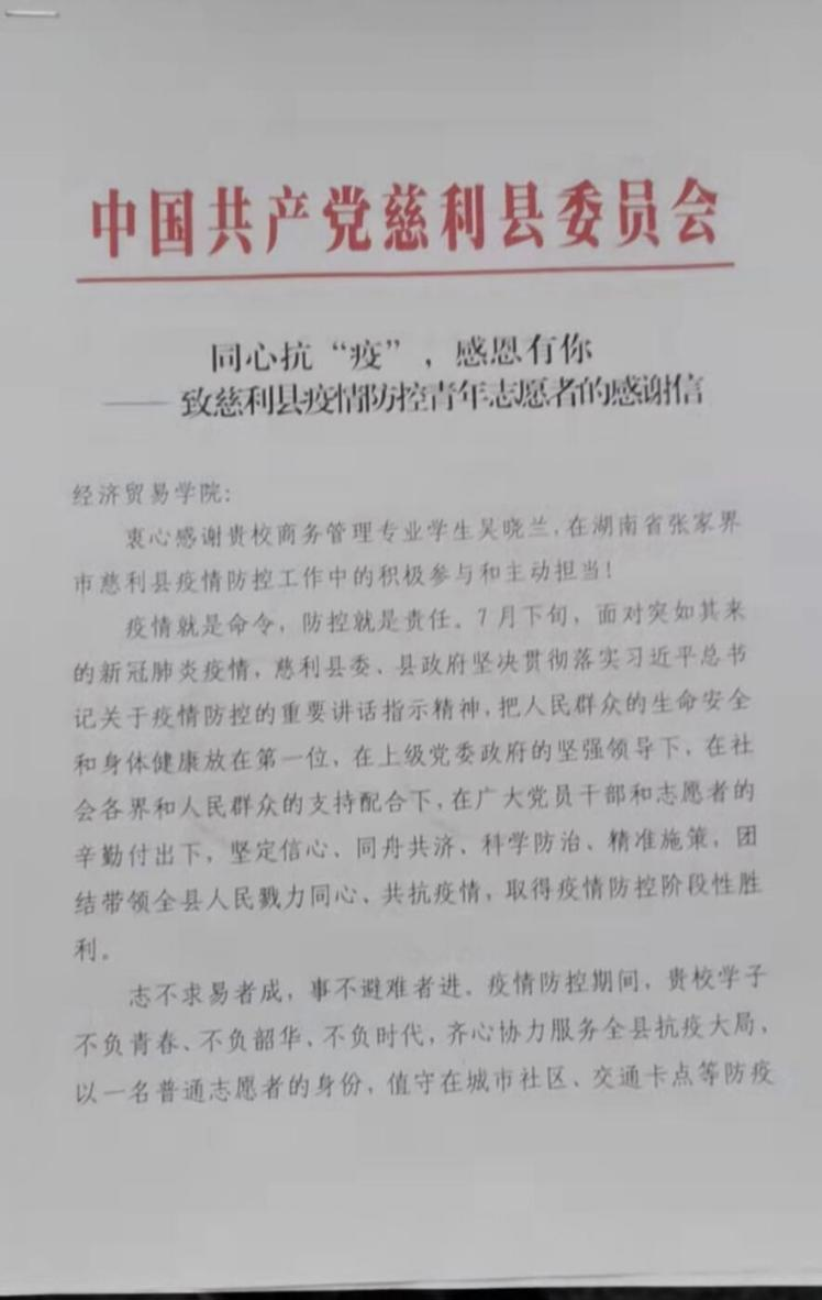 (通讯员 杨韵琴)“请您配合测量一下体温”“请您佩戴好口罩”“来往车辆请在这里登记”......在那个炎热的暑日里,戴着口罩,拿着体温计,跑前跑后的年轻人,已经在疫情防控岗位志愿服务多天。她就是湖南商务职业技术学院经济贸易学院吴晓兰同志。
