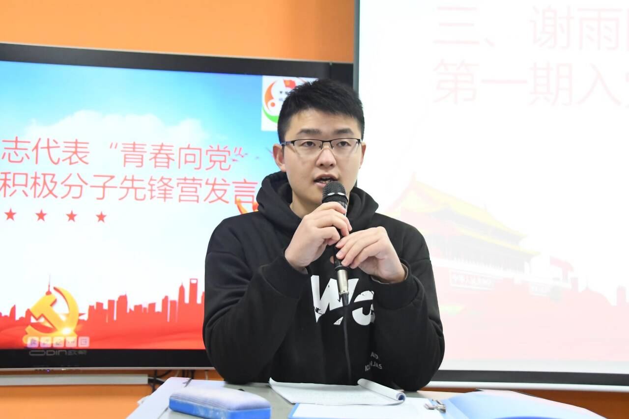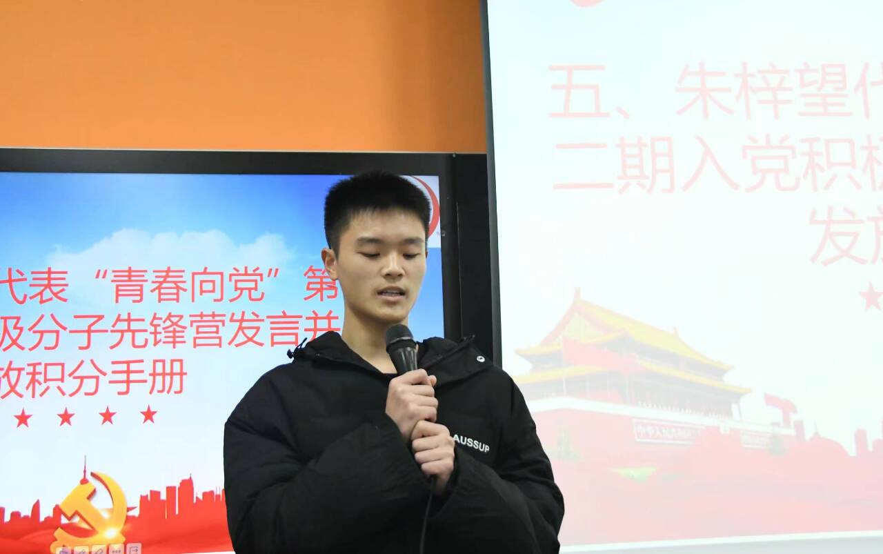 接下来,学生党员代表谢雨同志分享了自己为什么要加入先锋营?他说:“我真正意义上了解中国共产党是在高中时期。那时,通过阅读,我知道了中国共产党有敢为天下先的责任担当以及敢叫日月换新天的雄心壮志。中国共产党成立之初只有五十几名党员,正是从这五十几名党员开始成立的中国共产党带领中国人民推翻了几千年来压在中华民族和中国人民头上的三座大山。正是因为他们不畏艰难,敢为天下先的精神深刻影响着我,在第一期“青春向党”入党积极分子先锋营开营时,我满怀热血加入了先锋营。我认为,先锋营的‘先’就体现在敢为天下先。在加入先锋营之后我积极参加活动,发挥自身特长。在此我谨代表第一期“青春向党”入党积极分子先锋营全体成员祝贺大家成为先锋营的一份子。希望你们传承“心忧天下,敢为人先”的湖湘文化精神,不负青春、不负韶华,用奋斗谱写青春华章。”