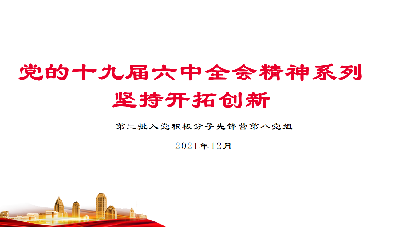 (通讯员 蒋晓霞 王世超)为深入学习党的十九届六中全会精神,深刻领会坚持开拓创新的重要意义,12月28日19:00,经济贸易学院学工党支部于二教101教室(经济贸易学院分党校)组织开展“聚焦十九届六中全会”第四次学习活动“坚持开拓创新”。经济贸易学院学工党支部全体党员、入党积极分子参与此次活动,此次活动由第二期“青春向党”入党积极分子先锋营谢雄辉同学主持。