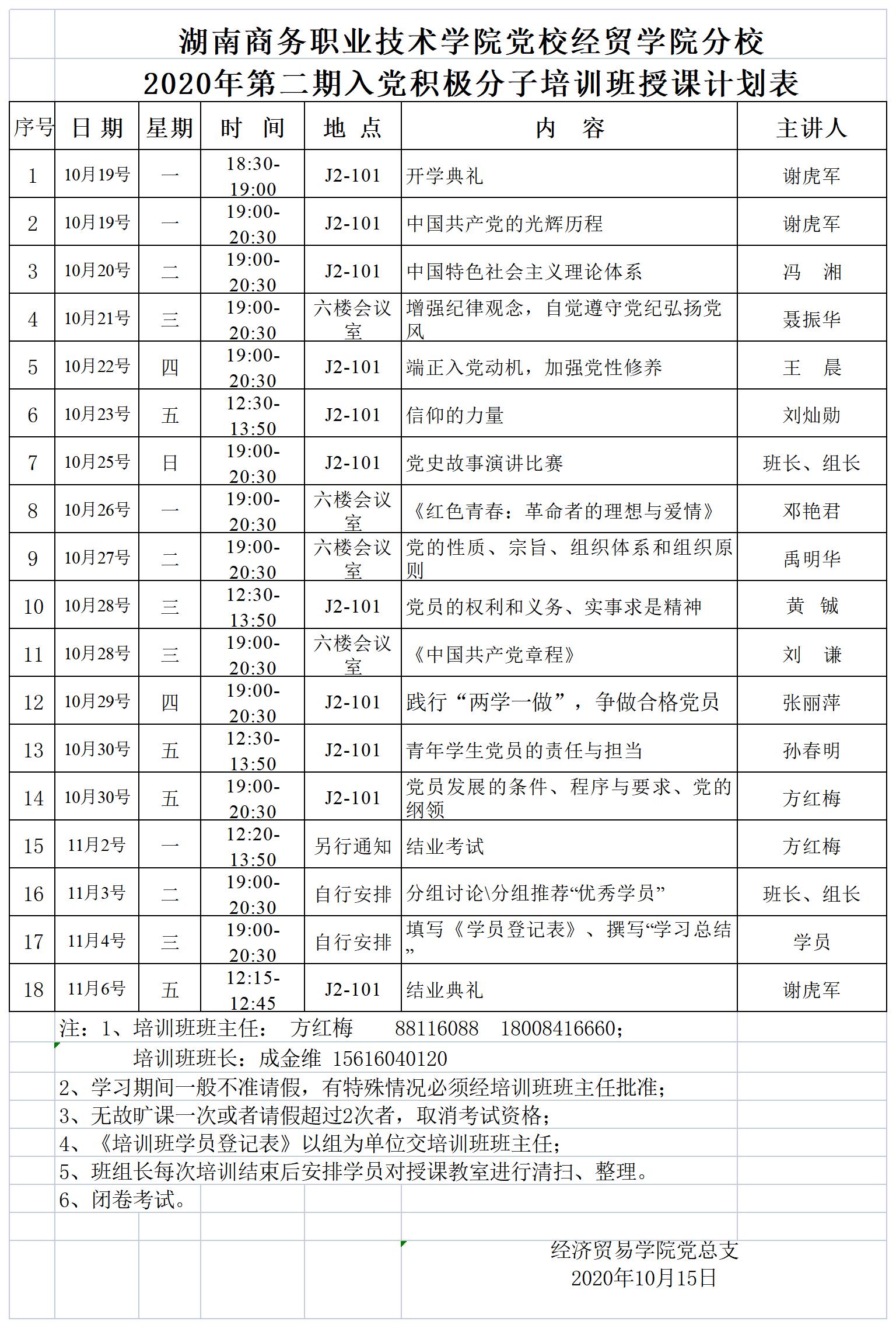 湖南商务职业技术学院党校经贸学院分校2020年第一期入党积极分子培训班授课计划表
