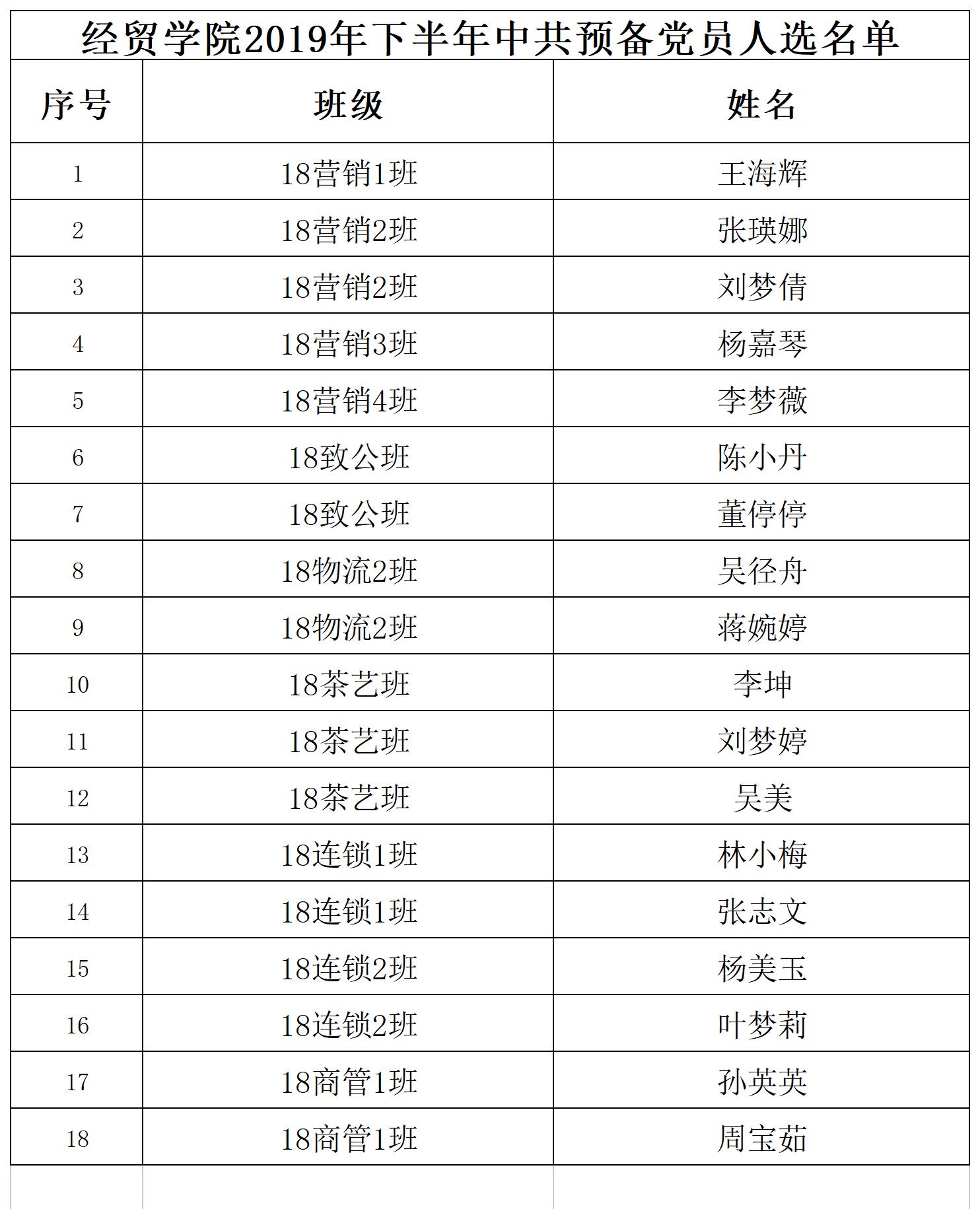 经本人申请、党校培训、党支部培养教育和考察,拟将王海辉等18名同志接收为中共预备党员,并于近期召开支部大会讨论。为发扬民主,广泛听取群众意见,根据党组织关于发展新党员实行公示的规定,现将18名同志情况予以公示: