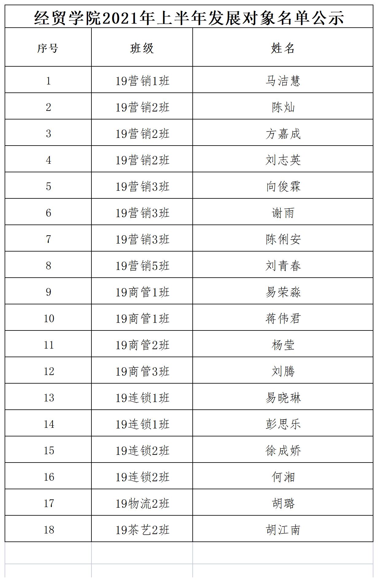 按照发展党员工作有关规定,经支部委员会研究,报上级党委备案同意,将马洁慧等18名同志列为发展对象。报据发展党员工作有关要求,现将其有关情况予以公示。