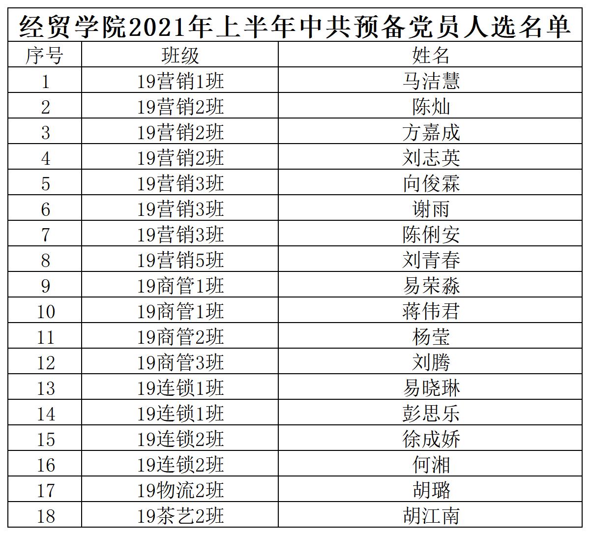经本人申请、党校培训、党支部培养教育和考察,拟将马洁慧等18名同志接收为中共预备党员,并于近期召开支部大会讨论。为发扬民主,广泛听取群众意见,根据党组织关于发展新党员实行公示的规定,现将18名同志情况予以公示: