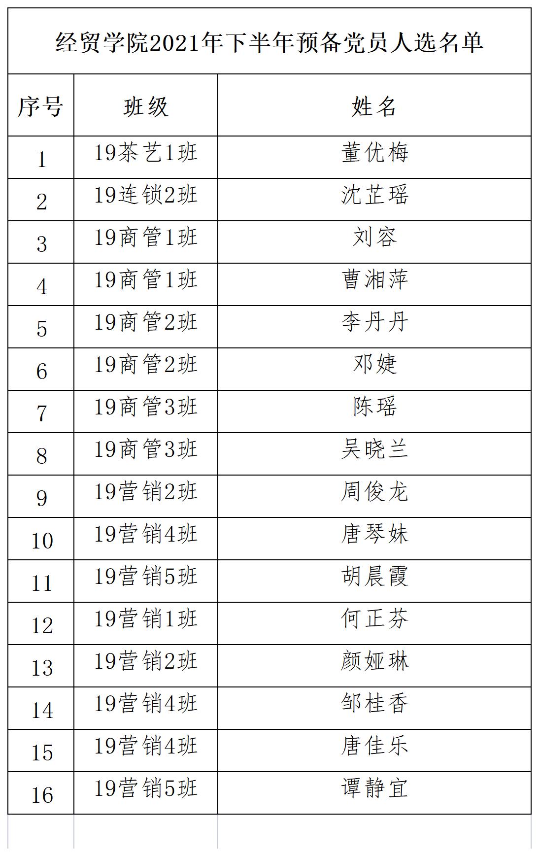 经本人申请、党校培训、党支部培养教育和考察,拟将董优梅等16名同志接收为中共预备党员,并于近期召开支部大会讨论。为发扬民主,广泛听取群众意见,根据党组织关于发展新党员实行公示的规定,现将16名同志情况予以公示: