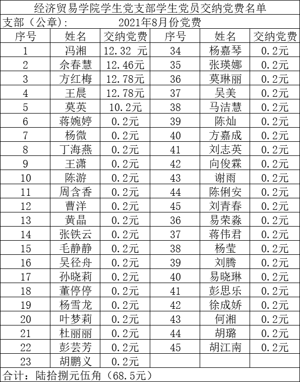(通讯员 周自立)为进一步增强党员对党员身份的认同感,强化党性意识、增强组织观念,坚定理想信念。2021年8月3日,经济贸易学院学工党支部以线上收缴的形式组织开展第二十期“主动交纳党费,做合格党员”主题活动。此次活动由经济贸易学院学工党支部全体党员参加。