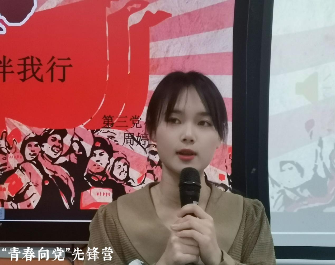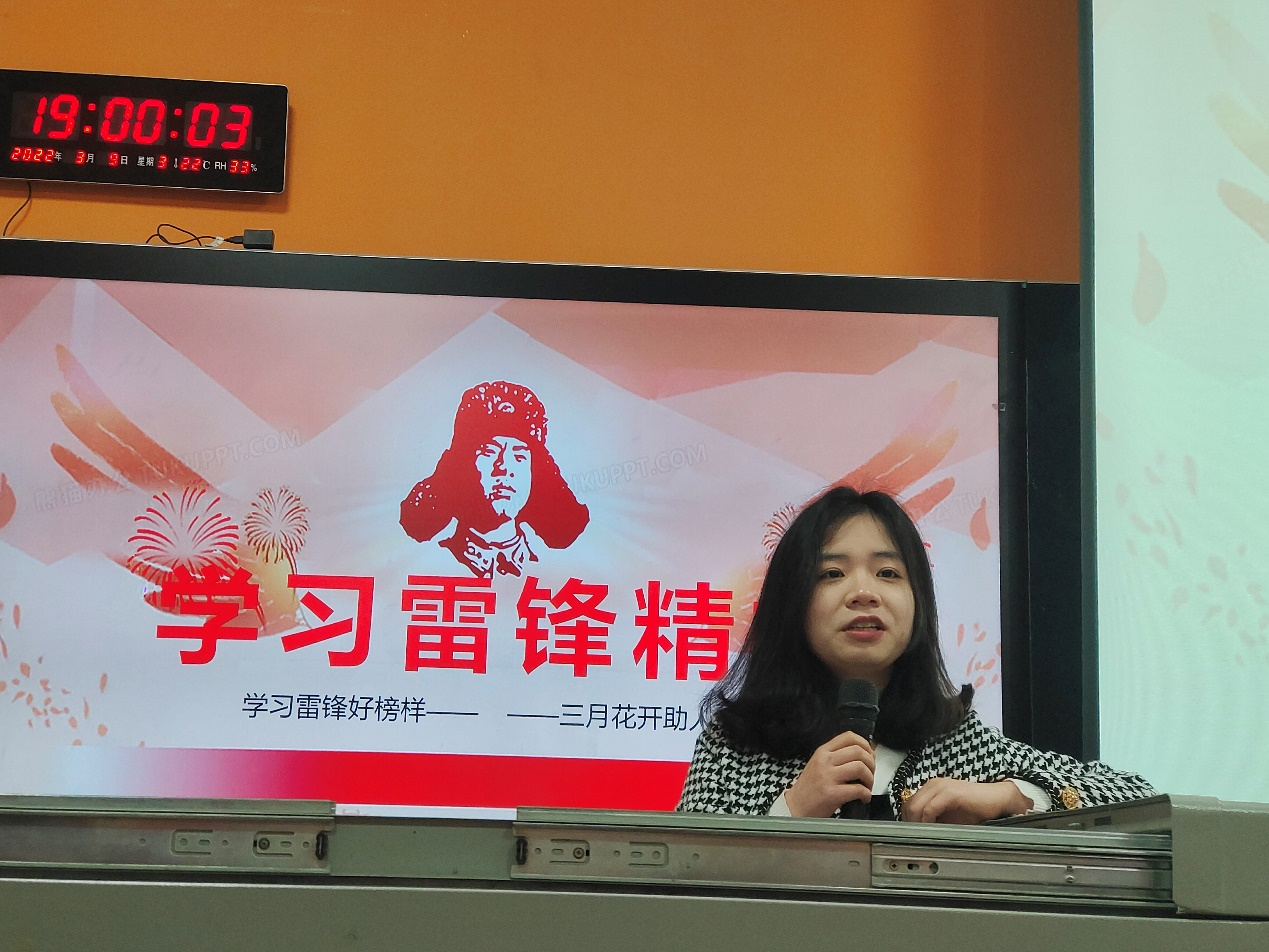 随后,周婷同学带领大家重温了雷锋用行动践行为人民服务的宗旨的故事。“人的生命是有限的,但为人民服务是无限的,我要把有限的生命投入到无限的为人民服务中去。”雷锋日记中的这句话完美诠释了生命的意义不在于长短,而在于对社会的贡献。无数挺身而出的抗疫战士们、抗洪救灾的志愿者们,他们立足本职、默默奉献,个个都是活雷锋,他们把自己奉献给社会,用行动践行着雷锋精神。