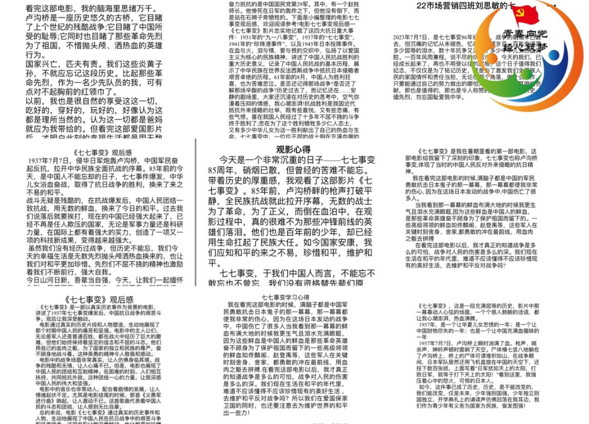 观影结束后,同学们一一写下了心得感悟。其中,22级全媒体1班李敏分享道:“虽然我们没有经历过战争,但历史不能忘。我们今天的幸福生活是无数先烈抛头颅洒热血换来的,也让我们对和平更加珍惜。先烈们不屈不挠的精神激励着我们不断前行。”22级营销1班陈好分享道:“七七事变中,一位位不屈的战士倒在充满血腥的卢沟桥上,石狮子仿佛也在为他们哭泣。南京大屠杀中,日本侵略者竟视中国人的生命为草芥,进行了一次次的杀人比赛,将手中的屠刀向无辜的中国人挥去……。往事依稀,现实催人。澎湃的心在激昂中渐渐趋于冷静。而我们对历史的认识又有多少呢?我们除了了解这一段屈辱的历史,了解这段艰苦的历程之外,更要紧的是要踩稳脚下的土地,以执着的干劲和高昂的斗志去开创新的篇章!”