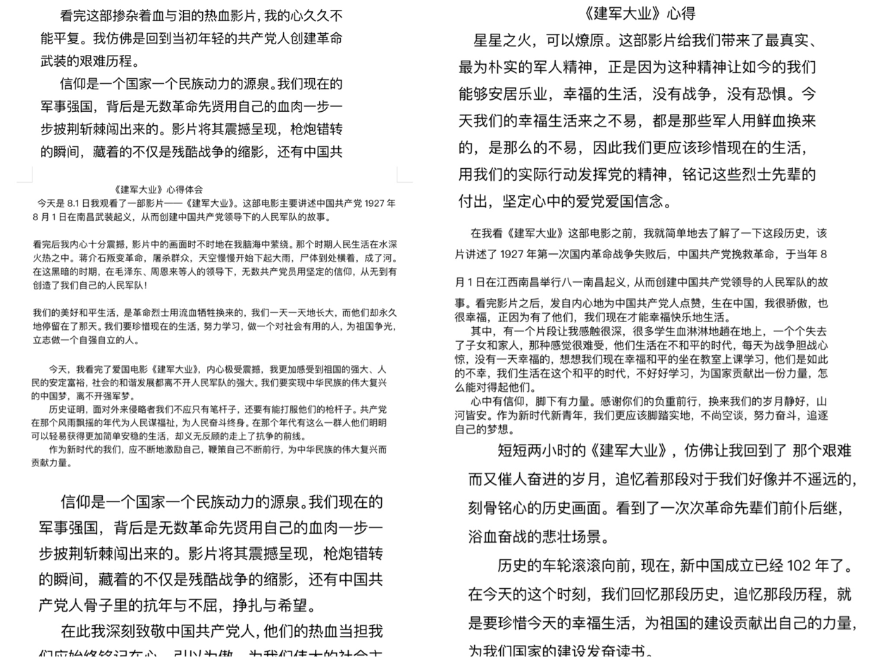 观影结束后,大家心潮澎湃,纷纷执笔写下观看心得。其中,22级市场营销5班何桂香写道:“短短两小时的《建军大业》,仿佛让我回到了那个艰难而又催人奋进的岁月,追忆着那段对于我们好像并不遥远的、刻骨铭心的历史画面。有一个片段让我感触很深,很多学生血淋淋地躺在地上,一个个失去了子女和家人,那种感觉很难受。他们生活在不和平的时代,每天为战争胆战心惊,没有一天幸福的。想想我们今天的幸福生活,如果我们不练好本领,不为中华民族的伟大复兴贡献一份力量,怎么对得住他们的付出呢?”22级商务管理1班赵宇欣分享道:“信仰是一个国家、一个民族前进的动力源泉。我们现在的军事强国,背后是无数革命先贤用自己的血肉一步一步披荆斩棘闯出来的。影片将其震撼呈现,枪炮错转的瞬间,藏着的不仅是残酷战争的缩影,还有中国共产党人骨子里的抗争与不屈,挣扎与希望。今天这个特殊的日子里,让我们一起致敬中国军人!致敬最可爱的人!”