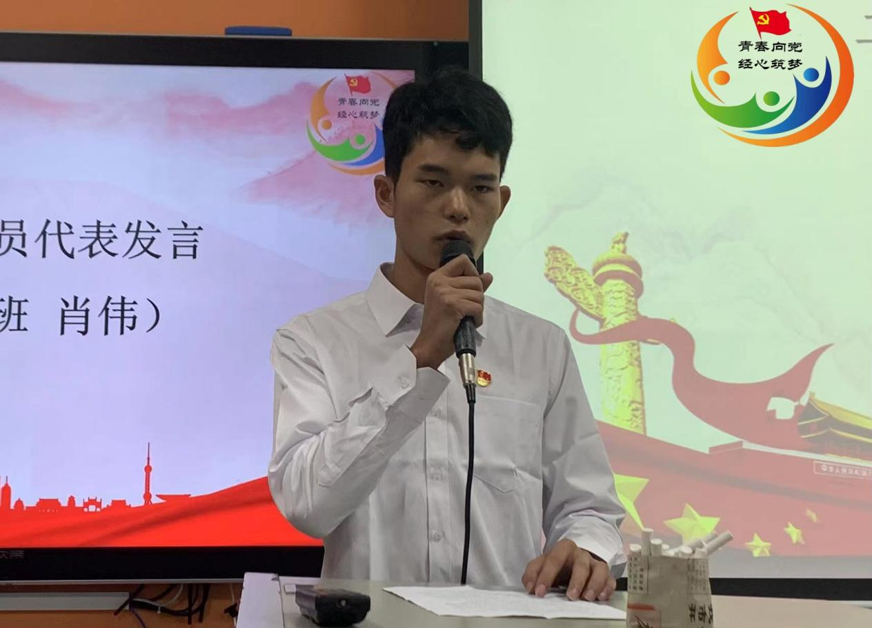 仪式第三项,由21级茶艺2班的肖伟同志作为中共预备党员进行发言。他谈道:“我在入党积极分子先锋营里结识了一群非常优秀的朋友们,我们一起积极参与党课的理论学习、志愿服务活动等等,在这些学习和做志愿服务的过程中,我渐渐明白了‘一名党员就是一面旗帜’这不仅仅是一句口号,这更加是一种责任担当。”