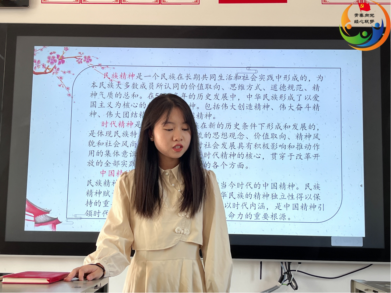 中国精神,这是一种独特的力量,它源于我们深厚的文化底蕴,展现出我们民族的精神风貌。它融合了我们的传统美德和现代社会的价值观,体现了我们国家的凝聚力和向心力。首先,主持人以“习近平总书记在第十二届全国人民代表大会第一次会议上的讲话中讲到的‘实现中国梦必须弘扬中国精神。这就是以爱国主义为核心的民族精神,以改革创新为核心的时代精神。这种精神是凝心聚力的兴国之魂、强国之魂。’”引入本次党日活动的主题。随后,她从中国精神的含义、中国精神的意义、怎样弘扬中国精神三个方面组织大家一起学习。