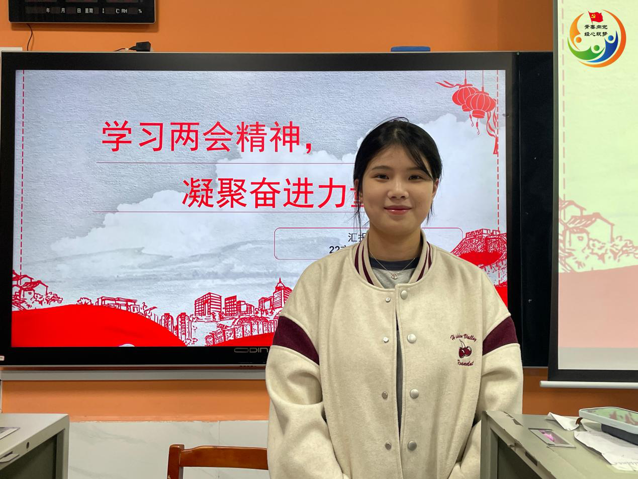 随后,主持人组织大家就“两会了解知多少,对于青年说有什么感悟?”进行自由分享。其中,22级全媒体广告策划与营销1班张宝贵说道:“每年的两会都应该是我们关注的焦点。通过当年举行的两会,我们能够在第一时间准确认识到党和国家的发展要求和工作方向。从而了解国际国内形势,认清大局、明辨是非、站对立场,坚决拥护党中央和国家所做出的科学决策。”22级市场营销2班陈城分享道:“乡村教师李柏霖、新农人向小菲,她们都是湖湘大地的好女儿,在热爱的乡土上造福当地百姓。在2024年全国两会的“春风”吹拂下,以实际行动,诠释着春天的希望。毕业后,我也想尽我所能,为家乡做点事情。在生我养我的地方找到人生出彩的舞台,在实现自身梦想的同时,带动乡亲们就业致富。”