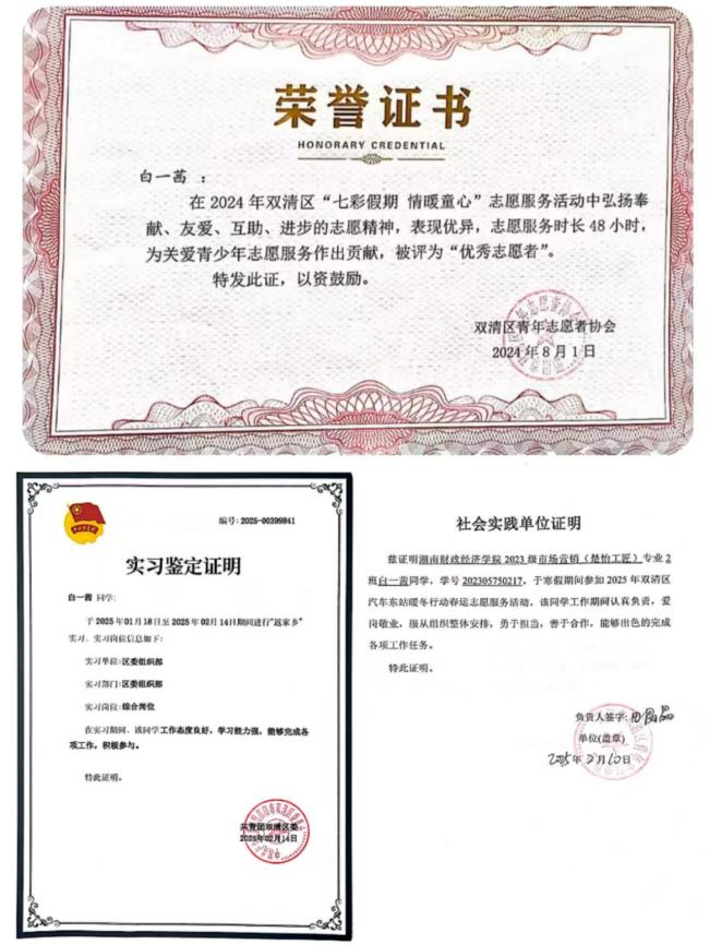 她积极响应家乡团区委的号召,投身于“以青春之名 赴家乡之约”——双清区2025年寒假大学生“返家乡”社会实践活动,同时参与双清区政府组织部综合岗位的实习,以及团区委“暖冬行动·情暖旅途”春运志愿服务活动,用实际行动诠释着青春的担当与奉献,为家乡的和谐美好贡献自己的力量。