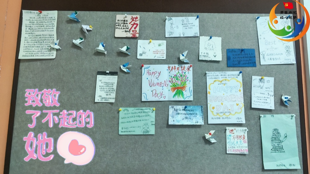 巾帼力量传递时代强音,温暖笔触绽放绚丽之花。大家利用课余时间,制作出了一张张内容丰富、精美绝伦的贺卡。当这些贺卡挂满 “芳华展示墙”时,春日的微风轻轻拂过,那些在纸间流淌的真挚祝福,宛如涓涓细流,汇聚成青年一代对“妇女能顶半边天”的深情礼赞,也映照出红色基因在新时代的青春华章。
