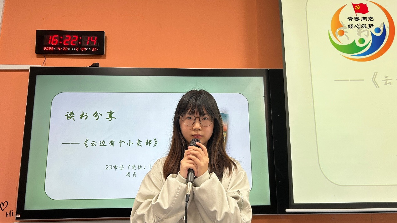 23级市场营销(楚怡)1班周贞为大家分享了张嘉佳的《云边有个小卖部》这本书,“在平凡又充满烟火气的时光里,刘十三的成长与蜕变,究竟承载着多少温暖与遗憾?”她说道,“请认真生活,在梳理,在云边的小卖铺,我们会相逢。”
