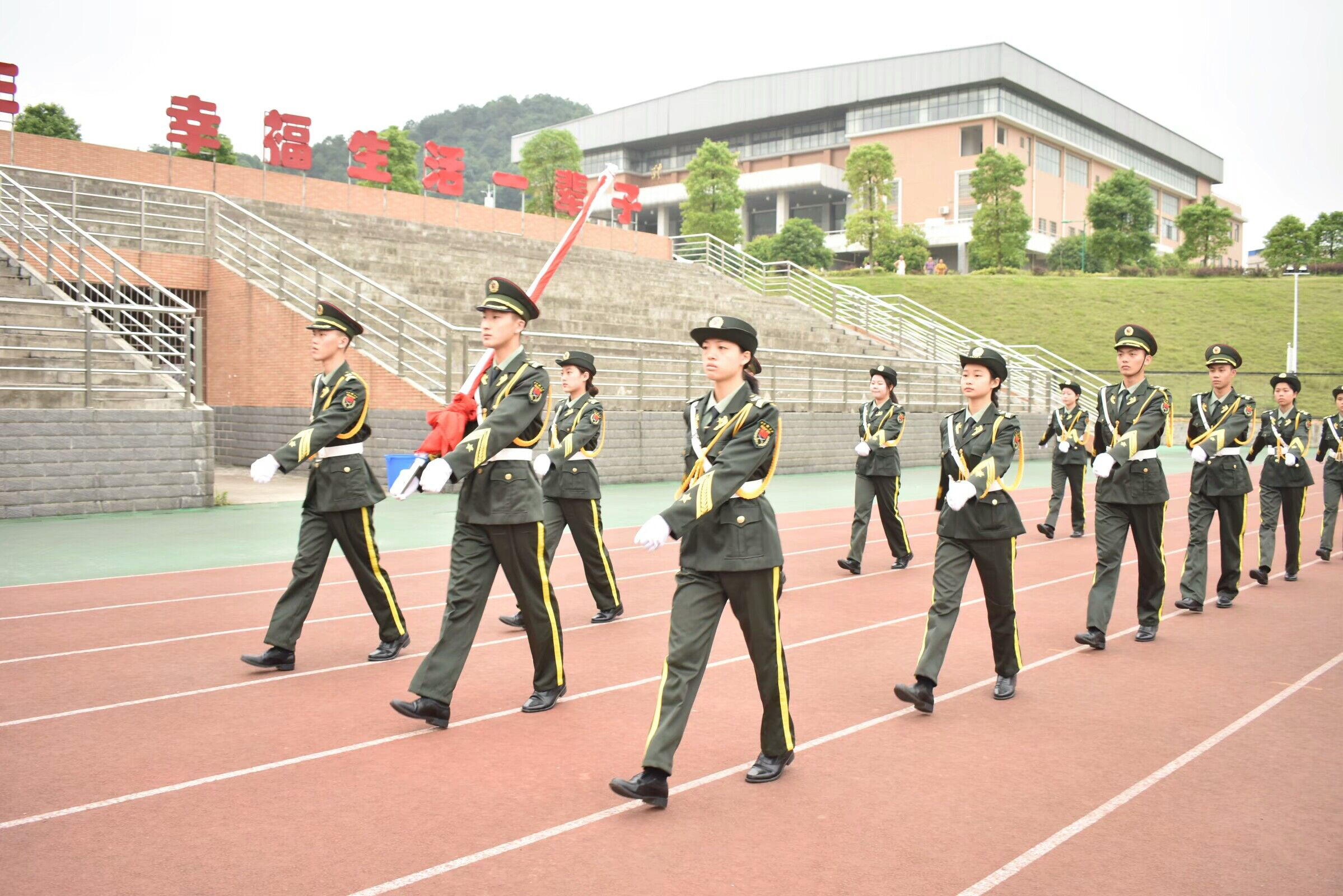 伴随着庄严的《义勇军进行曲》奏响,英姿飒爽的国旗护卫队踏着整齐的步伐护送鲜艳的五星红旗进场,五星红旗冉冉升起,全体师生行注目礼。