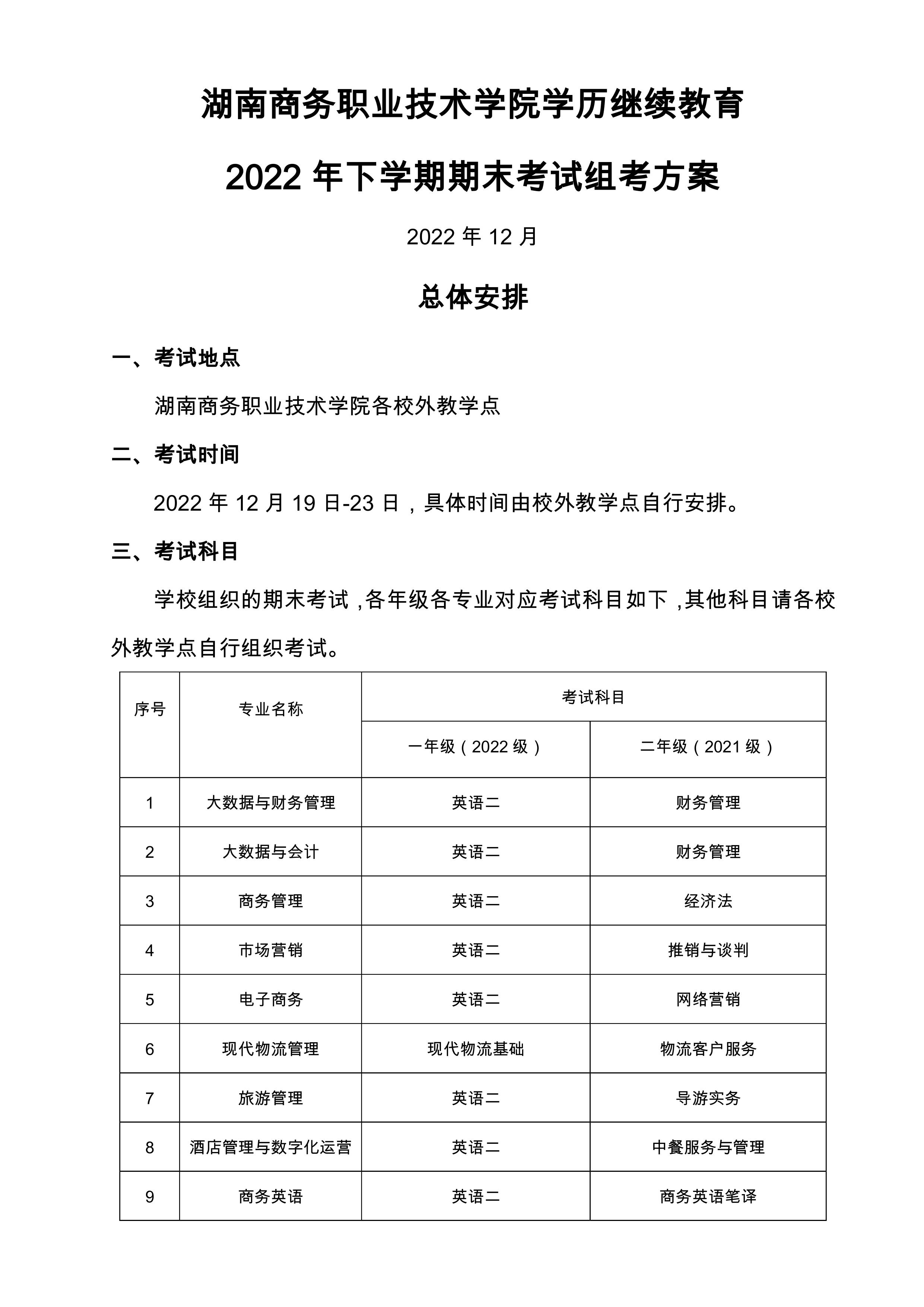 湖南商务职院成人教育2022年下学期期末考试组考方案