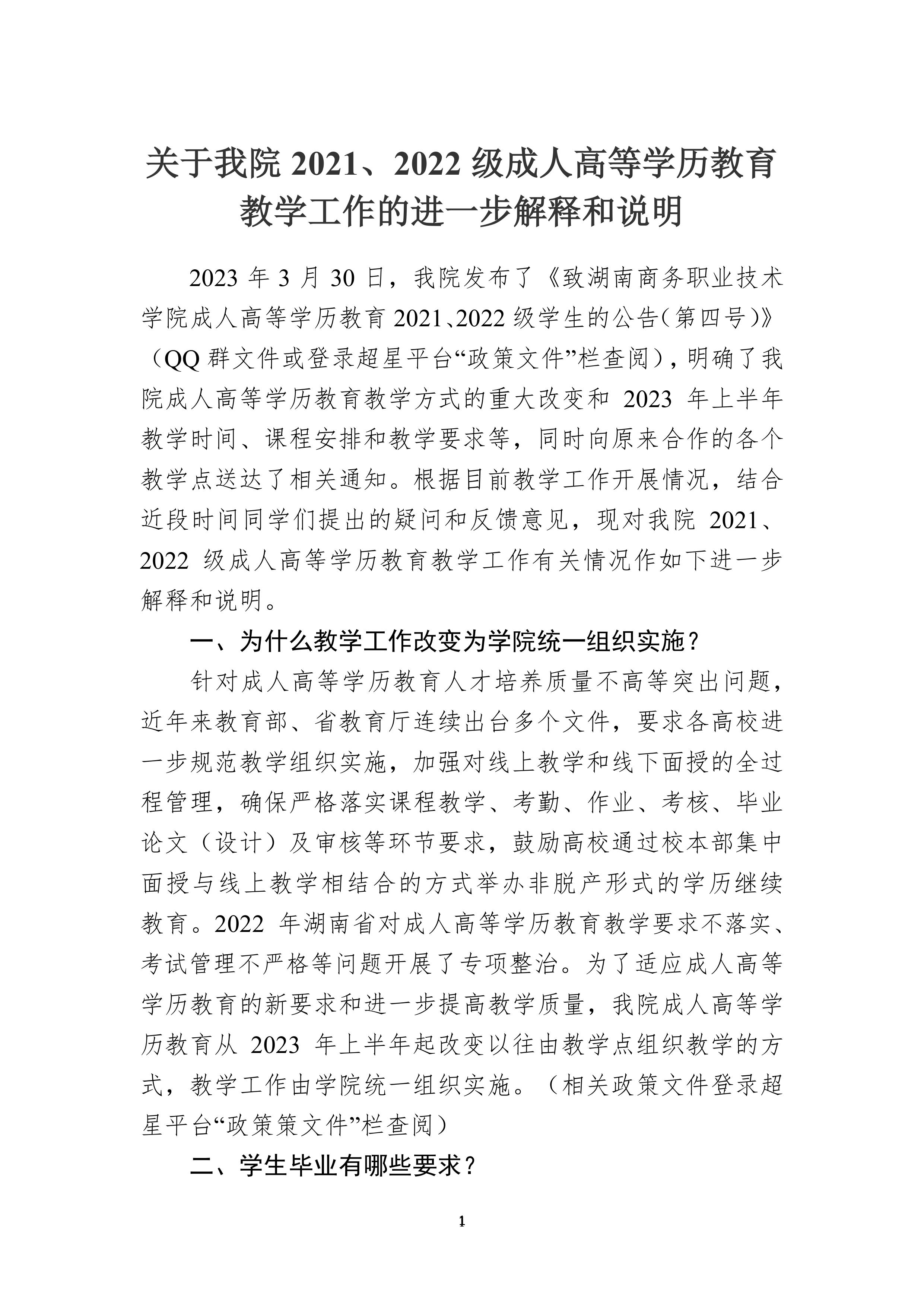 关于我院2021、2022级成人高等学历教育教学工作的进一步解释和说明