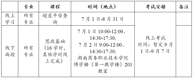 2023级成教新生集中报到时间为7月1日上午9:00-9:30,地点为湖南商务职业技术学院博学楼(第一教学楼)201教室。报到时领取电子版录取通知书和相关资料,组织开学典礼仪式。为减少大家来校次数和节约大家时间,开学典礼仪式结束后接着组织线下课程的教学。确因身在外地且确实时间冲突、生病等特殊原因不能来校报到的,需向班主任老师报备,并通过线上同步直播收看开学典礼仪式。