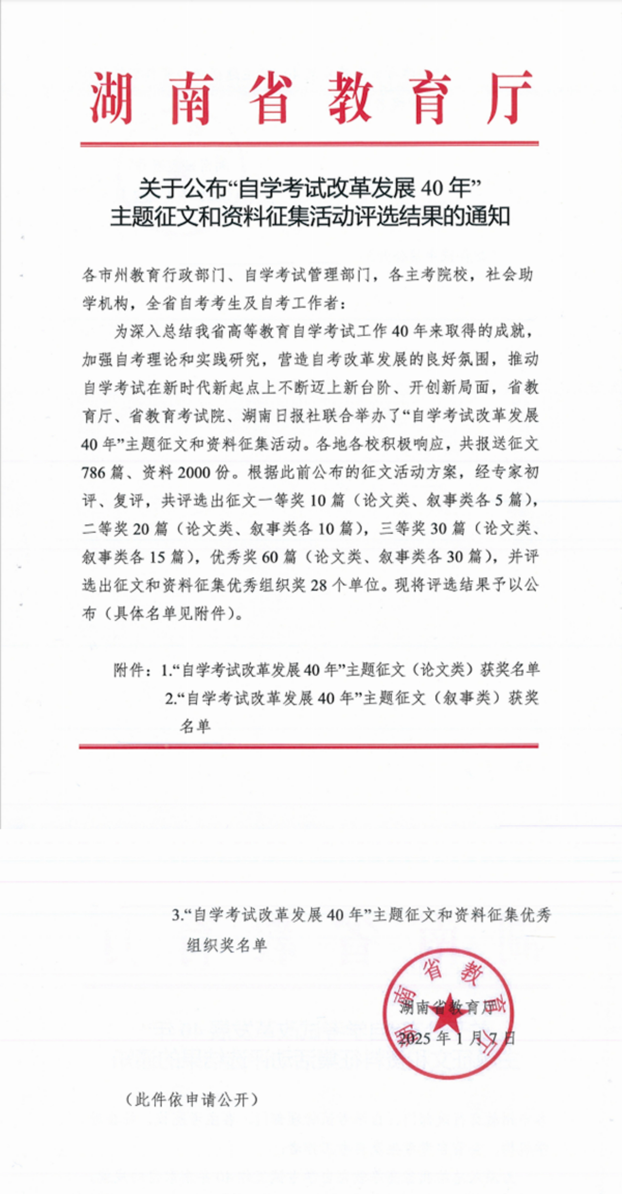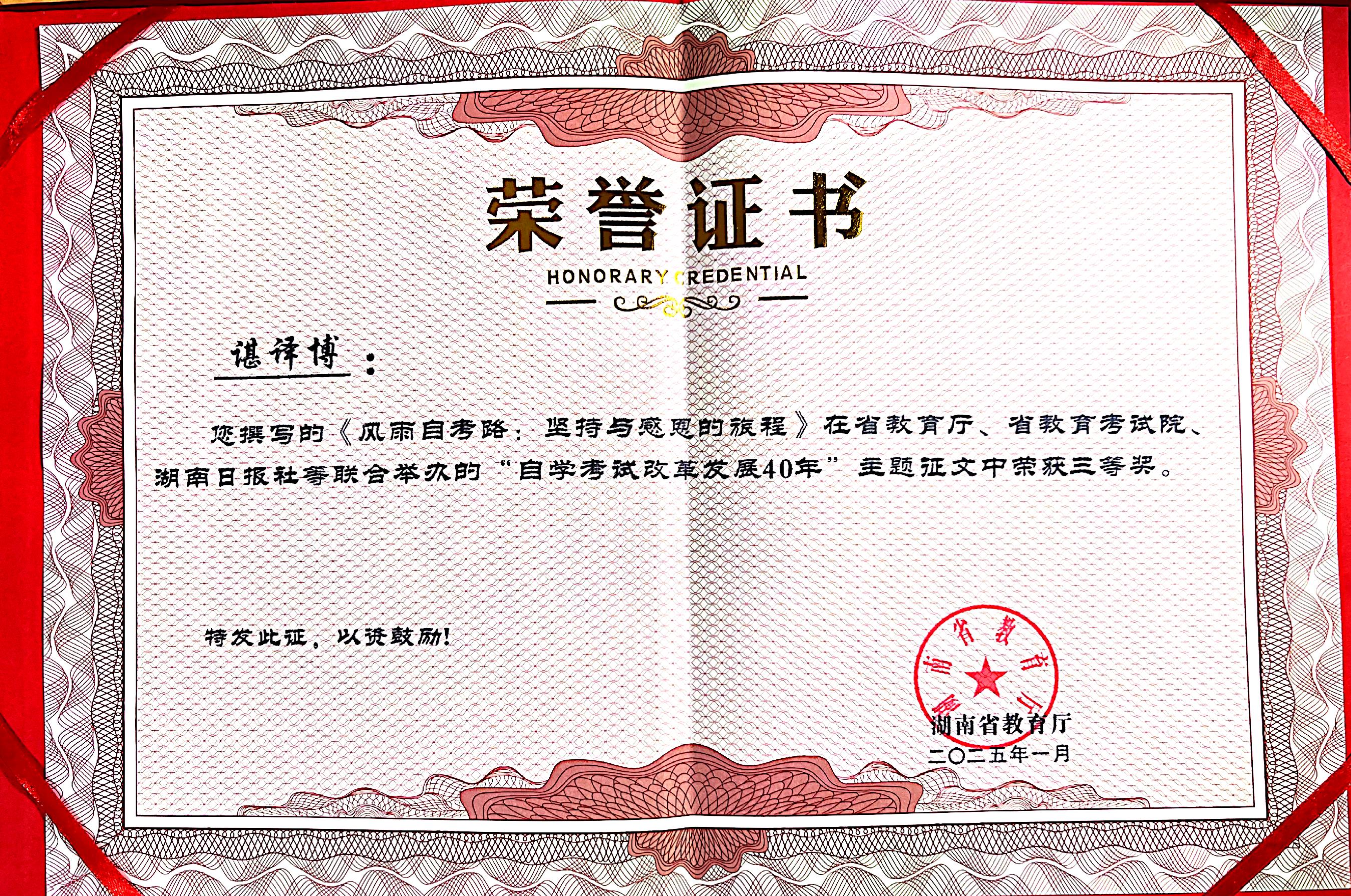 1 月 8 日,由湖南省教育厅、湖南省教育考试院、湖南日报社联合主办的湖南省“自学考试改革发展 40 年”主题活动评选结果出炉。我校会计学院 22 级学生谌译博撰写的《风雨自考路:坚持与感恩的旅程》荣获三等奖。