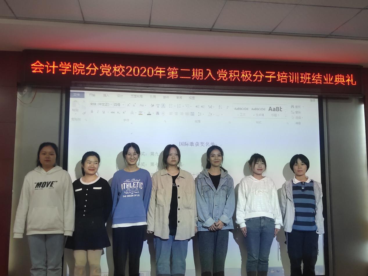 2020年11月5日中午12:30整,在二教201举行了中共湖南商务职业技术学院会计学院分党校2020第二期入党积极分子结业典礼。出席本次典礼的老师有会计学院党总支书记黄铖、学工一党支部书记朱泳霖以及全体第二期入党积极分子,本次典礼由黄姗姗主持。