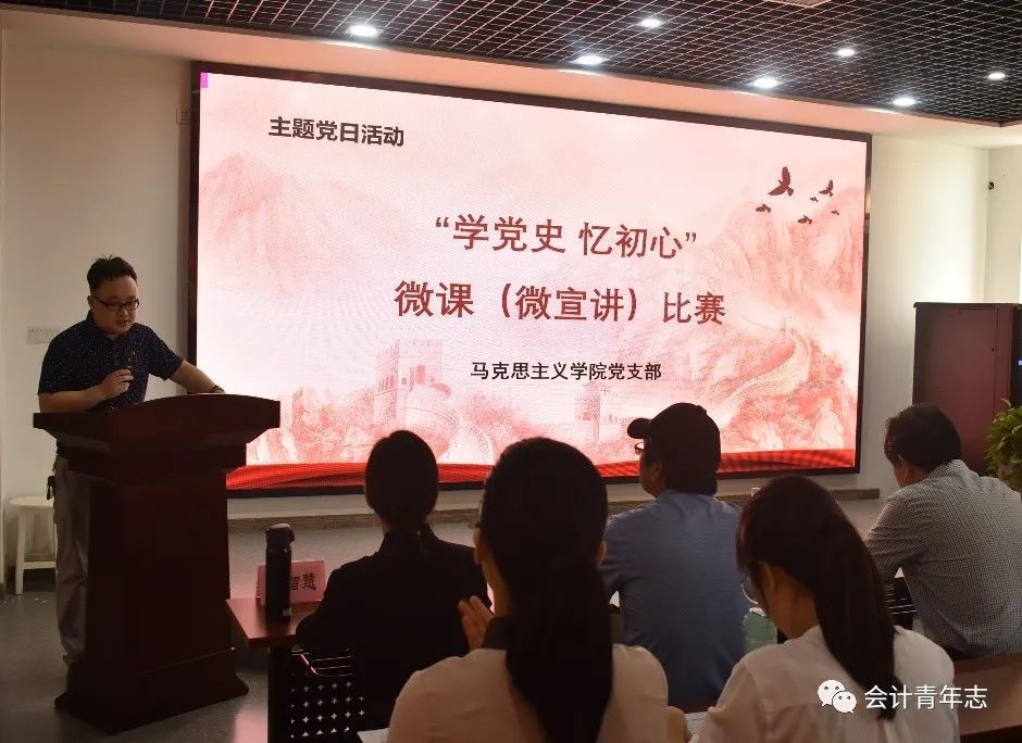 本次主题党日活动主要是由马克思主义学院的9位老师进行党史宣讲,学校党委周忠新书记等五人担任评委,会计学院党支部和机关一、四支部参与观摩学习讨论。首先由肖彬同志讲到:“党历来重视党史学习教育,用党的实践创造和历史经验启迪智慧、砥砺品格。站在喜迎中国共产党百年华诞的重大时刻,开展党史学习教育,必须不断围绕重点内容、聚焦核心要义,切实提高学习教育成效”。