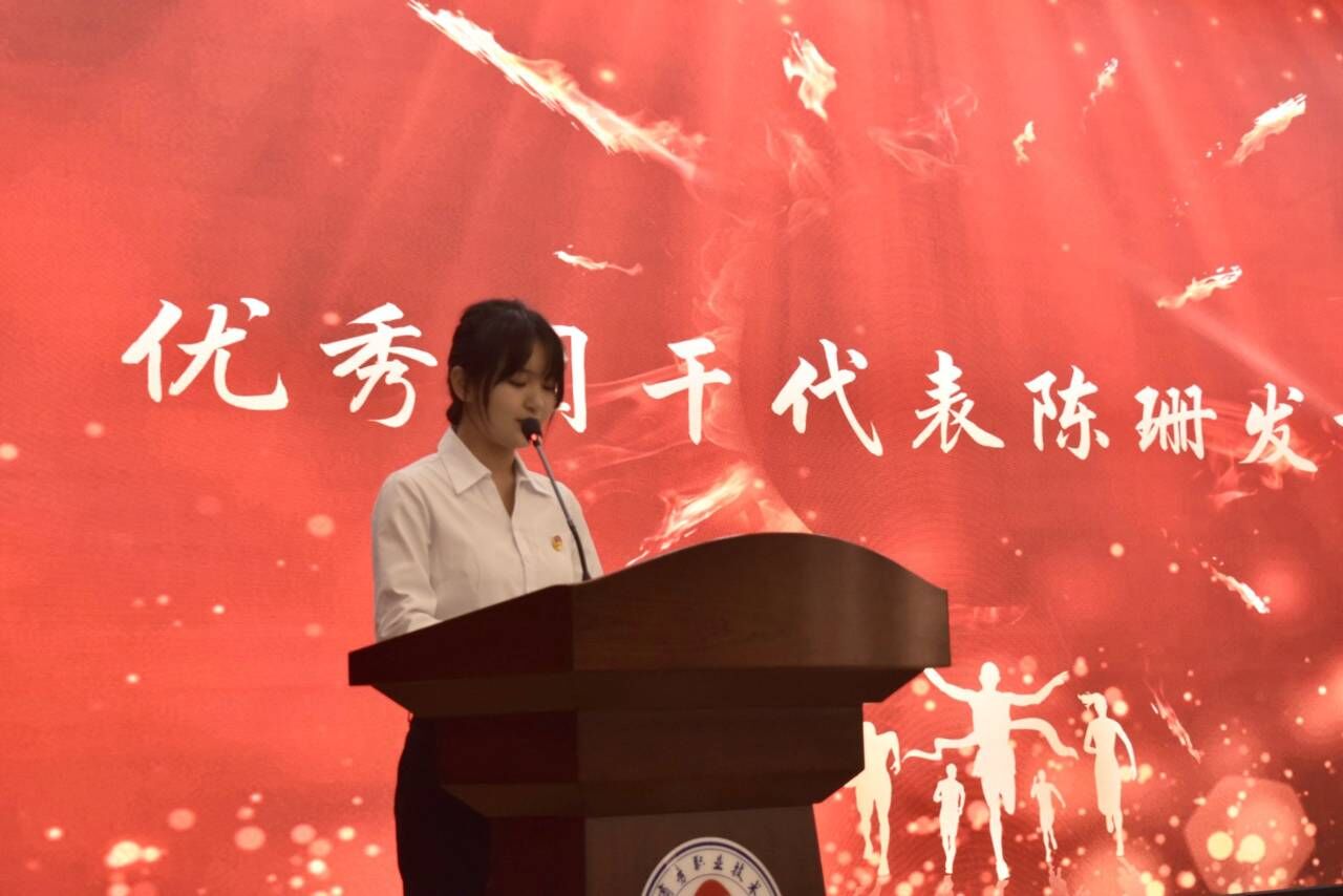 大会第四项,优秀团干代表陈珊发言。她分享了自己在学习、生活和工作中的宝贵经验,呼吁广大青年牢记使命,不忘初心,勇担青春使命并坚定不移地听党话,跟党走,怀抱梦想脚踏实地,敢想敢为,在学习和团青工作中发光发亮。