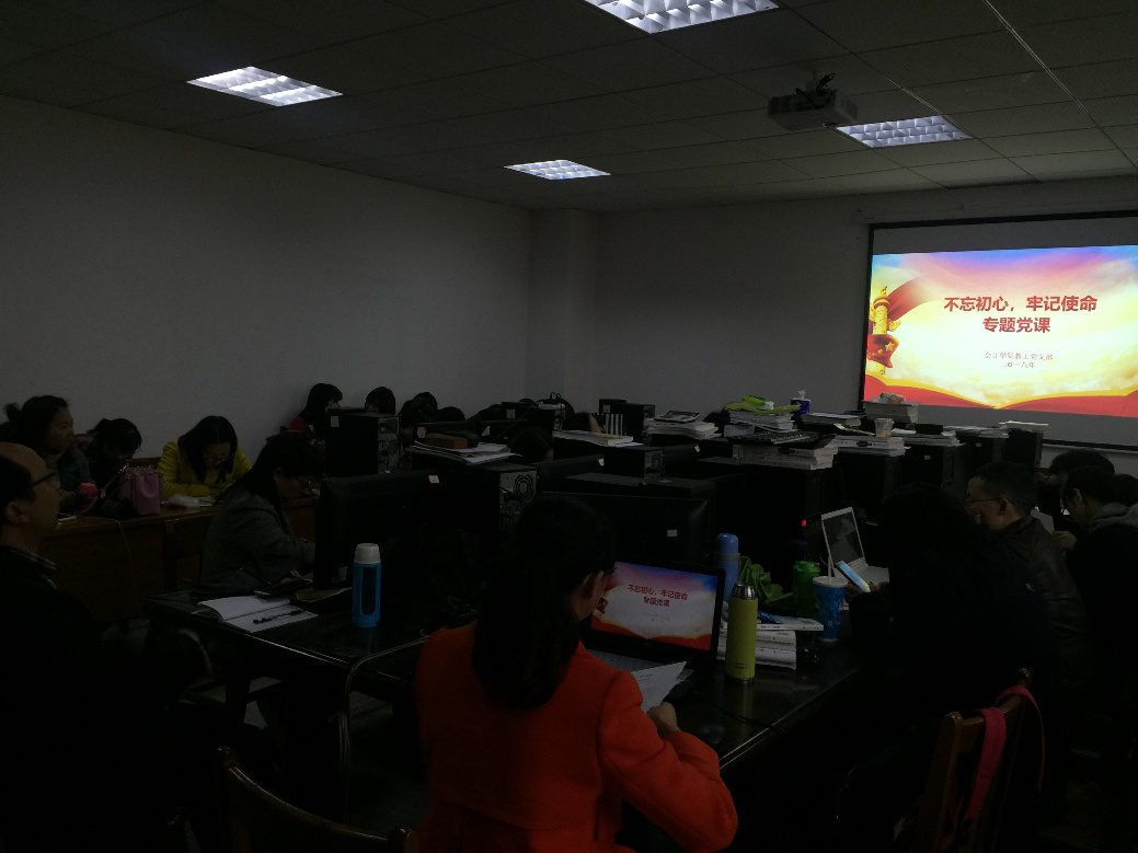 2018年11月13日1点30分,会计学院教工支部全体党员在B319进行《不忘初心、牢记使命》专题党课学习。