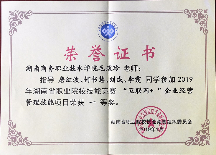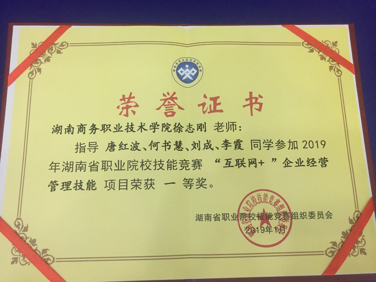 徐志刚、毛政珍老师指导学生获湖南省2019年互联网+企业经营管理技能比赛一等奖