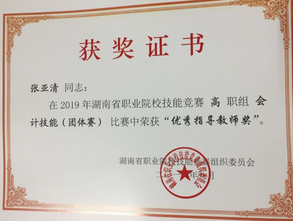 2019年9月,我院徐志刚老师在2019年湖南省职业院校技能竞赛高职组“互联网+”企业经营管理技能(团体赛)中荣获“优秀指导教师奖”;张亚清老师在2019年湖南省职业院校技能竞赛高职组会计技能(团体赛)中荣获“优秀指导教师奖”;洪娟老师在2019年湖南省职业院校技能竞赛高职组财税技能(团体赛)中荣获“优秀指导教师奖”。