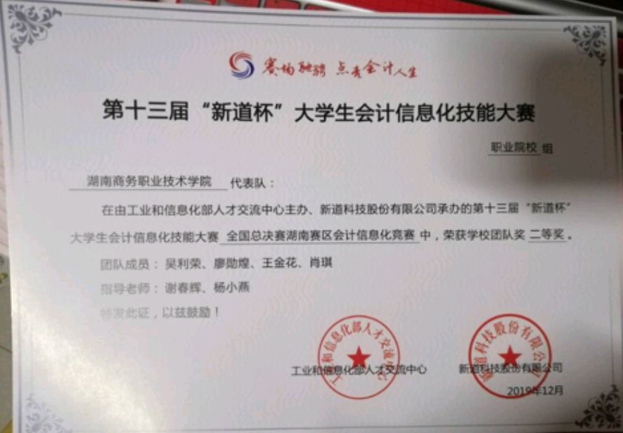 2019年12月,在第十三届“新道杯”大学生会计信息化技能大赛全国总决赛湖南赛区管理会计竞赛项目中,由谢春辉、杨小燕老师指导的两支参赛队伍均荣获了一等奖,其中一队由会计学院17会计2班袁涵琦、17会计4班杨聪、17会计1班卿玲媛,17会计2班李咪娜组成;另一队由18会计9班廖勋煌、18会计4班王金花、17会计2班肖琪、17会计2班吴利荣组成。指导老师谢春辉、杨小燕荣获“优秀指导老师”称号。