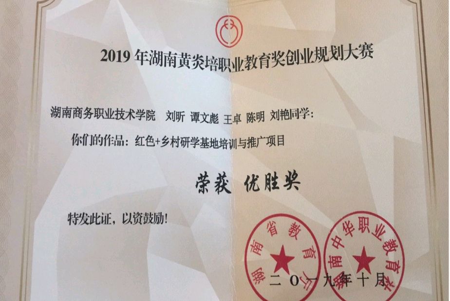 2019年10月, 由我院学生刘昕、谭文彪、王卓、陈明、刘艳组成的参赛团队在指导老师孙玲的带领下,凭借参赛作品—红色+乡村研学基地培训与推广项目,在2019年湖南黄炎培职业教育奖创业规划大赛中荣获优胜奖。