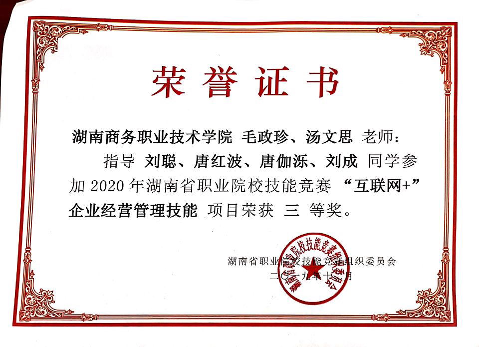 我院学生在2020年湖南省职业院校技能竞赛(互联网+企业经营管理技能)大赛中分别荣获二等奖、三等奖