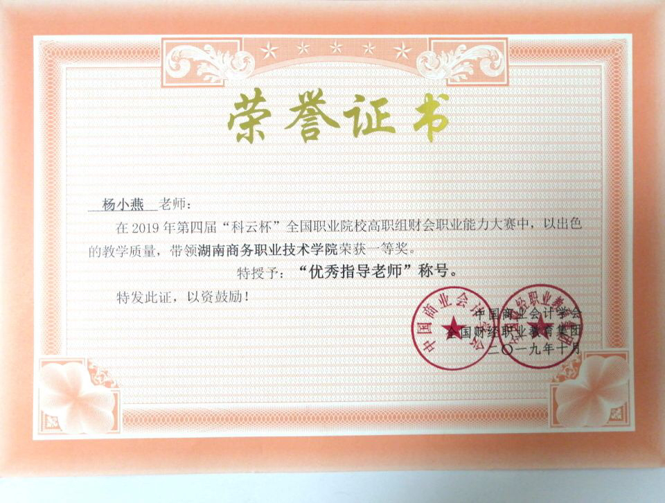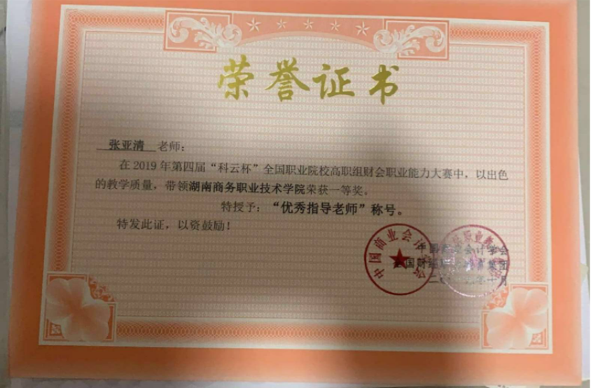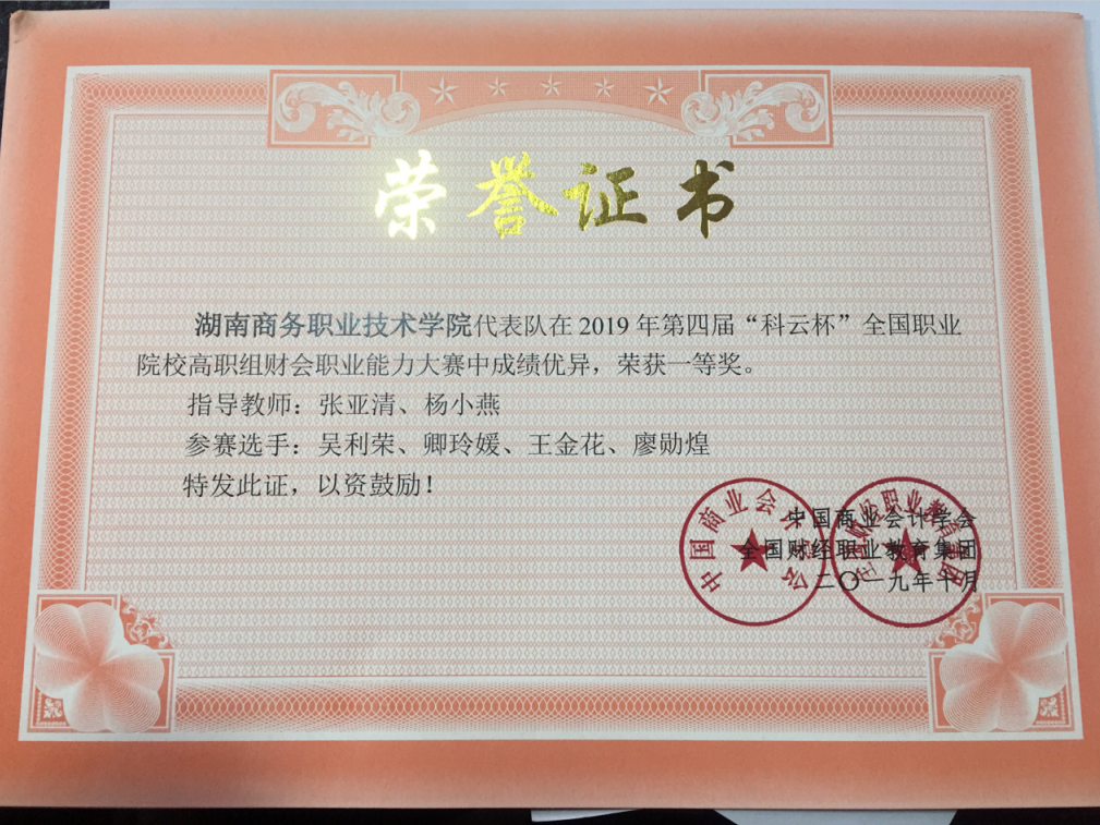 2019年10月, 由我院学生吴利荣、卿玲媛、王金花、廖勋煌组成的参赛团队在指导老师张亚清、杨小燕的带领下,在2019年第四届“科云杯”全国职业院校高职组财会职业能力大赛中以优异成绩荣获一等奖。指导老师张亚清、杨小燕荣获“优秀指导老师”称号。