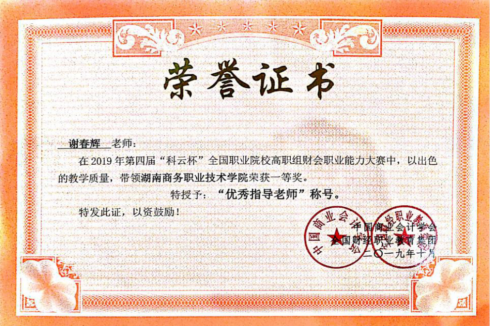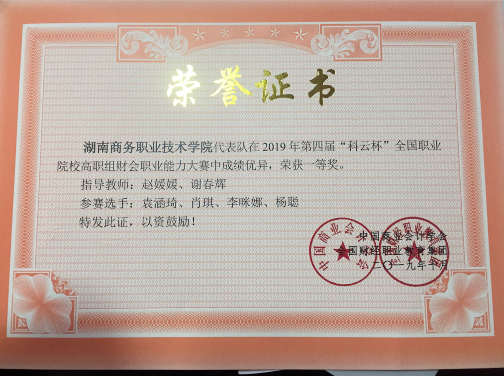 2019年10月, 由我校会计学院学生袁涵琦、肖琪、李咪娜、杨聪组成的参赛团队在指导老师赵媛媛、谢春辉的带领下,在2019年 第四届“科云杯”全国职业院校高职组财会职业能力大赛中以优异成绩荣获一等奖。指导老师志赵媛媛、谢春辉荣获“优秀指导老师”称号。