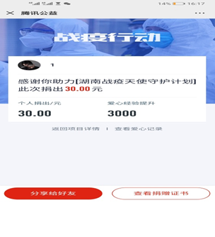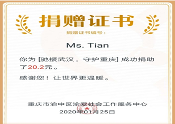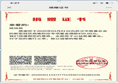 会计学院统计与会计核算专业,17统会4班姚铭艳同学,小善意,大温暖。向武汉市慈善总会的新型冠状病毒防控专项基金捐款。