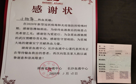会计学院统计与会核算专业,18统会3班于椰萍同学,为战“疫”的冲关夺隘添把助推,奉献爱心,在湖南省血液中心,长沙血液中心,献血。